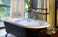 soak in a deep claw-footed bathtub, while huge glass windows keep you