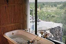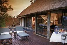 The Lodge on Leopard Hills Private Game Reserve is built on a hill overlooking a natural waterhole. The perennial Sand River is a sanctuary for many bird species and host to wallowing Hippo and basking Crocodile as it gently flows not far from camp. Each of the 8 luxurious glass-fronted accommodation suites, complete with their own sundeck and rock plunge pool, offer superb vistas of the African bushveld beyond, while air-conditioning and overhead fans provide welcome respite against the harsh African heat. The breath-taking romantic bathrooms, which include double indoor and outdoor showers, have windows which open to a glorious view of the passing wildlife below. Enjoy the privacy of your suite and salute the timelessness of Africa, over a drink from your fully-stocked mini bar. or drift into a deep and peaceful sleep whilst enjoying a full body massage. After our early morning and late afternoon/evening game drives, you will be spoilt by the highest standards of service and fine cuisine, all couched in a welcoming warm, friendly and fun-filled cellar brimming with racks of celebrated local and International wines. When the heat is on, cool down on the open air verandah, relax in the lounge with a drink, and when in Africa, do as the Africans do and sink below the refreshing surface of the swimming pool. The Library offer a setting of peace and tranquility, where you are welcome to browse through a large selection of literature and African Journals. In addition there is a secluded alcove where an internet facility is available. Early morning and late afternoon/evening game drives, in search of Africa's big game, are conducted by your knowledgeable professional ranger. State-of-the-art Land Rovers, specifically designed for Leopard Hills, with individual bucket seats with fold-down armrests will ensure your optimum safety and comfort for the wildlife safari game drives. |