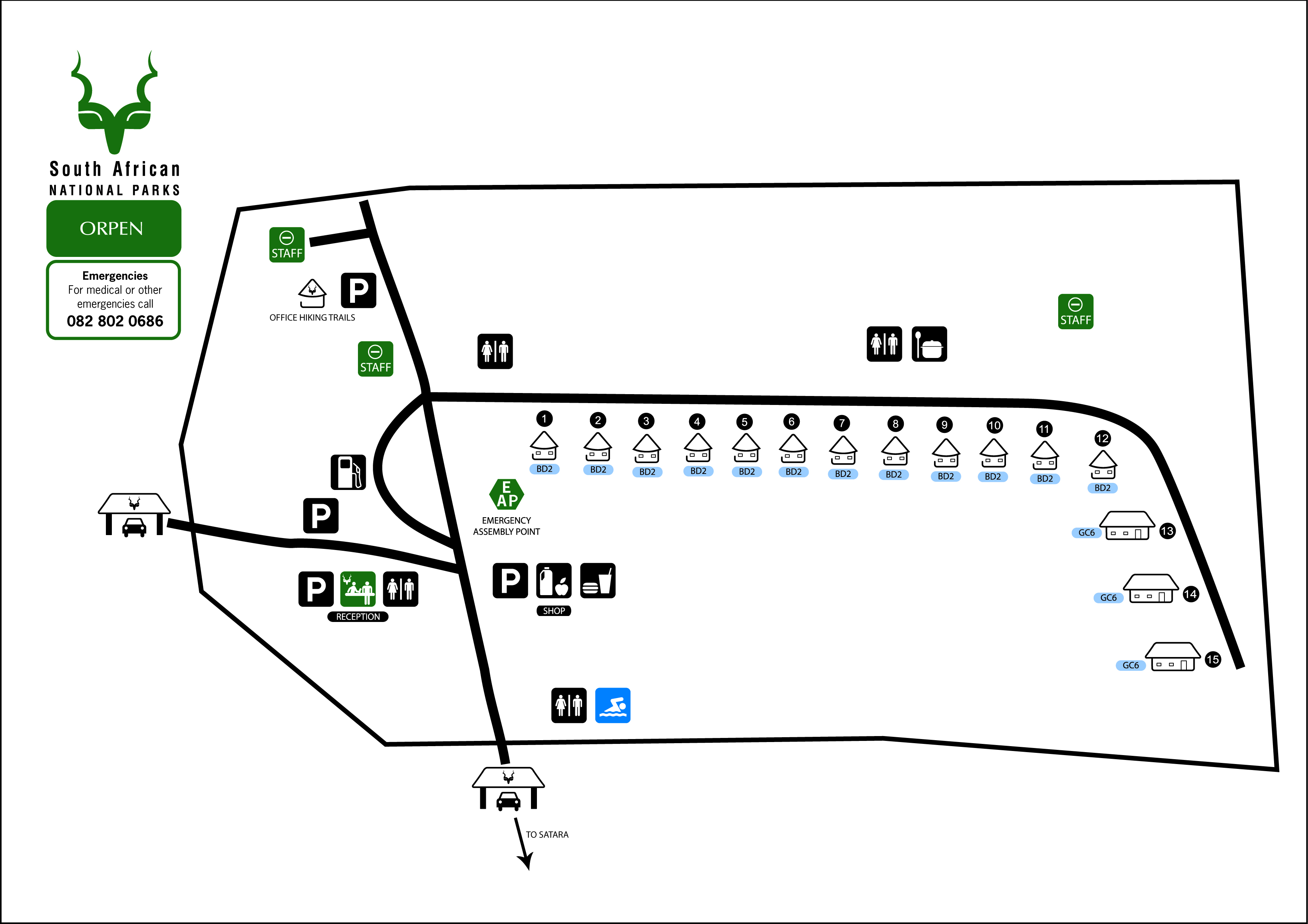 A small camp situated centrally on the western border of the KNP. The scattered trees and wide-open plains covered by sweet grass attract many browsers. This in turn, attracts the eye-catching cheetah, lion and leopard. Well known for its diversity of habitat and wildlife, Orpen offers visitors an excellent opportunity to experience close encounters with elephant, rhino, buffalo, lion and leopard in a natural environment. Wild dog, cheetah, zebra and giraffe are also indigenous to this area. Accommodation includes Huts and Bungalows at the main Orpen camp, as well as Campsites at the Maoela satellite camp and tented accommodation at the Tambotie satellite camp. Three tents at Tambotie are wheelchair friendly.